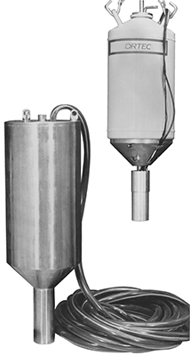 紧凑型(约37英寸长,12英寸直径)不锈钢护罩保护包含HPGe探测器元件、低温组件、20升LN2杜瓦瓶、LN2液位探头、前置放大器、高压滤波器和铅屏蔽体。开口式铅屏蔽体设置在探测器元件后面,以屏蔽池中的污染水,还为系统抵抗浮力。不锈钢外壳上有三个吊眼,外壳易于清洁或净化。所示的特定系统设计用于深达30英尺的水池深度。聚氯乙烯管用于放置探测器组件的电缆,并将LN2排放到水池表面。不锈钢护罩中设有一个薄(30密耳)侧窗,可使低能光子(低至50 keV)进入探测器组件。